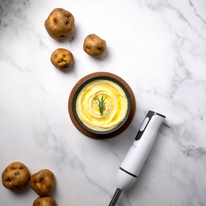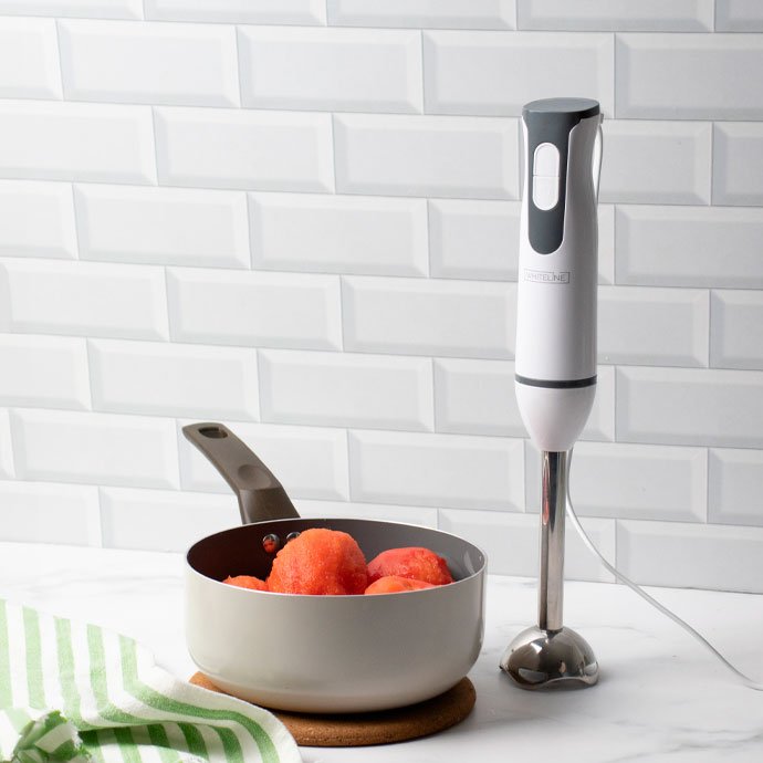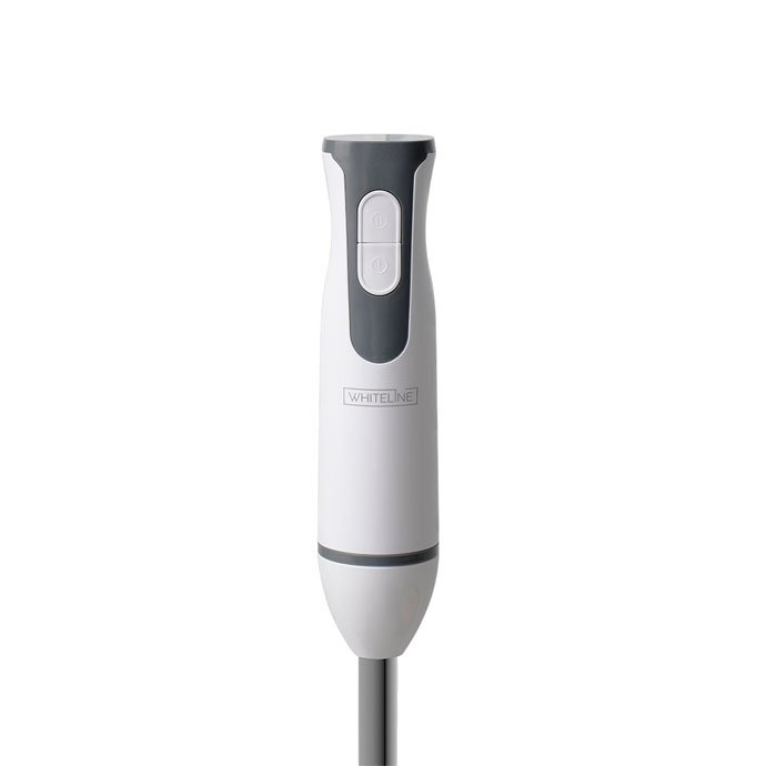La batidora de inmersión Whiteline con base y cuchilla de acero inoxidable es ideal para todas las cocinas.