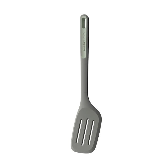 Voltear hamburguesas o panqueques, freír huevos o quitar galletas de una bandeja para hornear galletas, es pan comido con este volteador ranurado hecho en parte de plástico reciclado. Su cabezal de silicona resistente al calor, hecho con plásticos reciclados, con borde delgado y flexible se desliza fácilmente debajo de todos los alimentos y es seguro para su uso en utensilios de cocina con revestimiento antiadherente. Las tres ranuras permiten que el exceso de líquido y aceite se drene de la comida. Una vez que haya terminado, el volteador ranurado puede ir al lavavajillas para una limpieza rápida, después de lo cual el orificio en el mango permite un almacenamiento colgante conveniente.