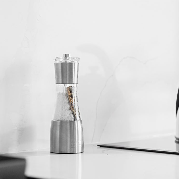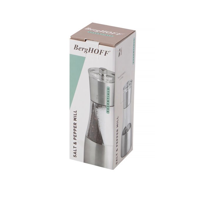 - Molinillo de sal y pimienta de acero inoxidable 18/10 con soporte de acrílico, acabado satinado.